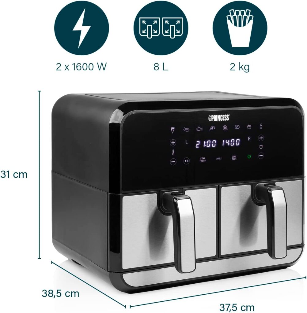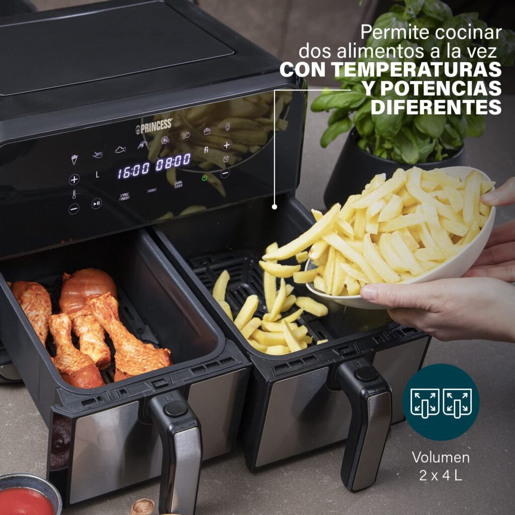 - Con esta freidora sin aceite de tamaño familiar de Princess con doble cesta, tienes múltiples posibilidades: prepara dos alimentos diferentes a la vez, sincroniza la cocción, controla los ajustes de temperatura y tiempo o elige el programa adecuado.